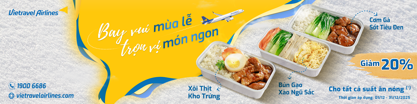 Vietravel Airlines hân hạnh mang đến chương trình Bay vui mùa lễ, trọn vị món ngon, ưu đãi giảm 20% cho tất cả suất ăn nóng đặt trước trên website trong suốt tháng 12. Đây là cơ hội để hành khách thưởng thức những bữa ăn nóng hổi, thơm ngon với mức giá tiết kiệm, đồng thời nâng cao trải nghiệm bay trong mùa lễ hội rộn ràng. Đặt trước ngay để tận hưởng hành trình trọn vẹn và đậm hương vị yêu thương cùng Vietravel Airlines!